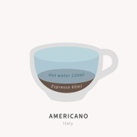 An americano (pronounced uh-meh-ree-KAH-no) or Caffè americano is a coffee drink made by diluting espresso with hot water. The amount of water vaires greatly depending on the café, region, or personal preference, but a typical americano is two shots of espresso with 120ml of hot water. A 2:1 water to espresso ratio.